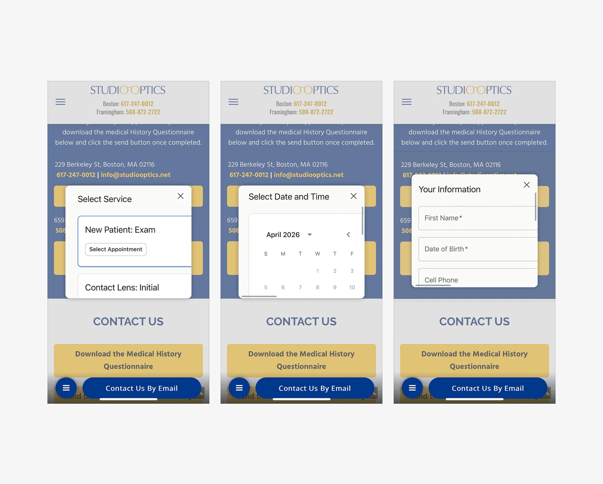 The existing experience uses an embedded booking widget that presents all options at once. Users must evaluate service type, location, and eligibility simultaneously before the system establishes context (e.g., new vs returning patient).